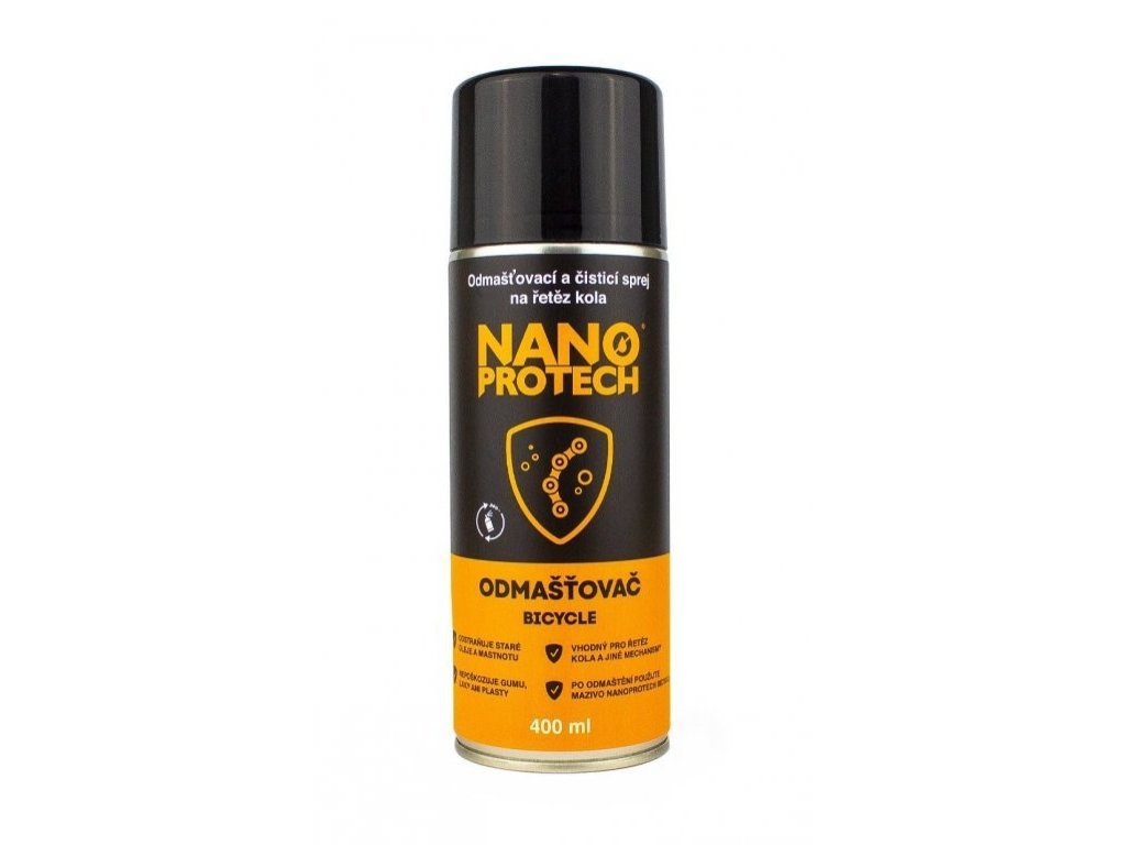 Odmašťovací a čisticí sprej na řetěz kola NANOPROTECH Bicycle odstraní rychle a účinně staré oleje a mastnotu ze všech mechanismů vašeho kola. Roztok se jednoduše aplikuje, nepoškozuje gumu, laky ani plasty a lze jej snadno setříthadrem či papírovým ubrouskem.