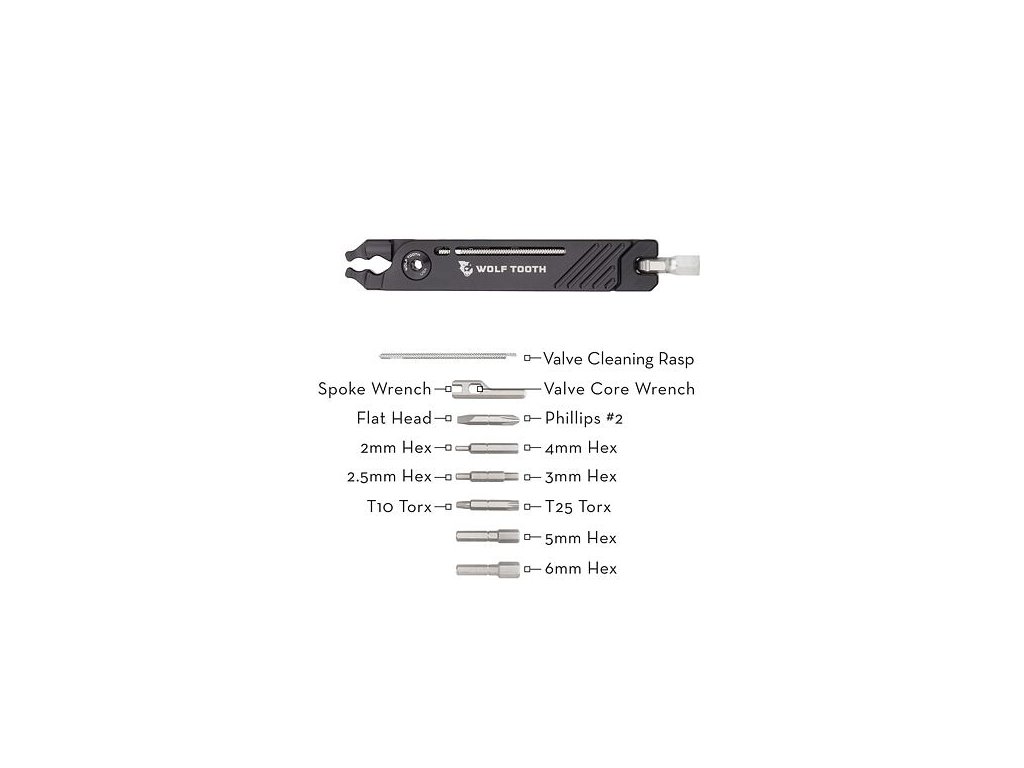 - 17 funkcí: centrovací klíč; klíč na jádra ventilků, bity: rovný šroubovák #3.5 a křížový Phillips #2 imbusy 2, 2.5, 3, 4, 5, 6, a 8mm; torxy T10, T25; kleště na rychlospojky řetězů; čistič zalepených těl ventilků; kleště na dotažení x povolení matky ventilků